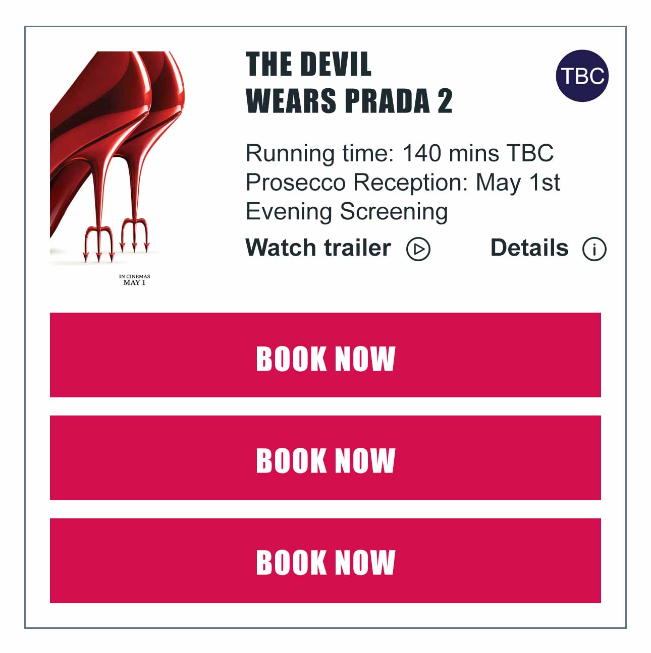 Join us on release night for a cinematic experience that’s as glamorous as the film itself. Guests attending the evening showing will be welcomed with a complimentary glass of prosecco — the perfect way to toast the return of one of fashion’s most beloved stories.